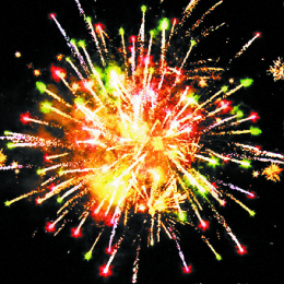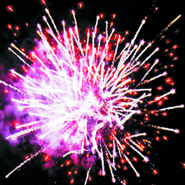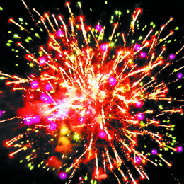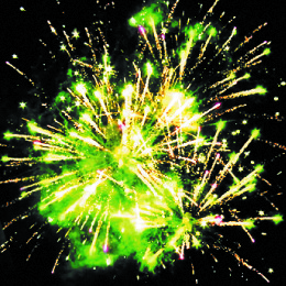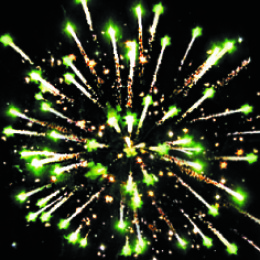 9-10. Выстреливает подряд: Громовые разрывы. Зелено-фиолетовые звезды с пышными хвостами (кокос) и белое мерцание.