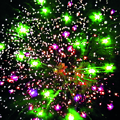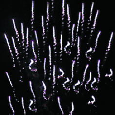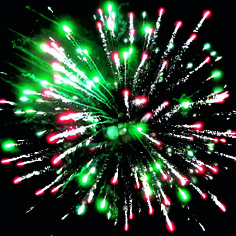 1-2. Выстреливает подряд: Красные звезды с пышными хвостами (кокос) и зелено-белое мерцание. Фиолетовые звезды с пышными