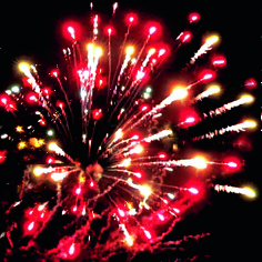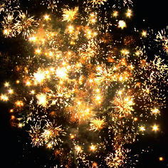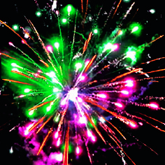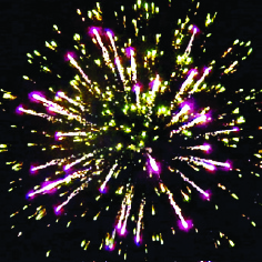 4-5. Выстреливает подряд: Желтые звезды с пышными хвостами (кокос) и красно-белое мерцание. Множество золотых ниспадающих нитей (парча) и фиолетово-зеленые звезды.