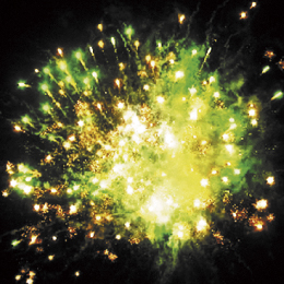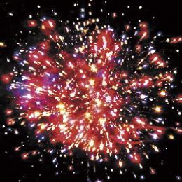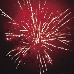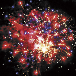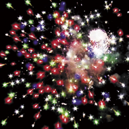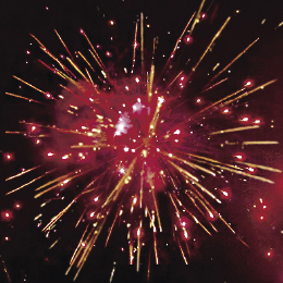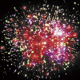 11-12. Выстреливает одновременно: Свистящие змейки. Красно-сине-желтая сфера (пион) и облако треска (трещащий дождь).