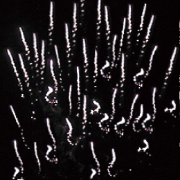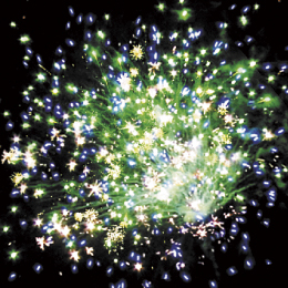 1-2. Выстреливает подряд: Множество серебряных ниспадающих нитей (парча) и красные звезды. Множество серебряных ниспадающих нитей (парча) и зеленые звезды.