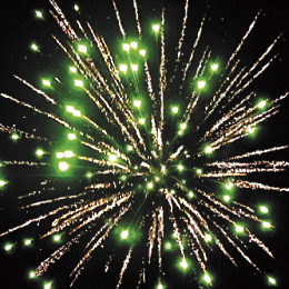 9-10. Выстреливает подряд: Зелено-сине-золотая мерцающая сфера (пион). Сине-красно-зеленая мерцающая сфера (пион).
