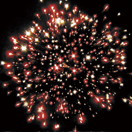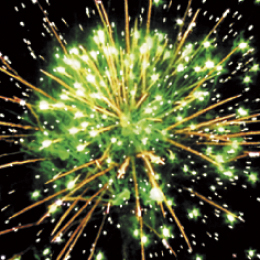 3-4. Веер. Выстреливает подряд: Множество золотых ниспадающих нитей (парча), красные звезды и треск. Множество золотых ниспадающих нитей (парча), зеленые звезды и треск.